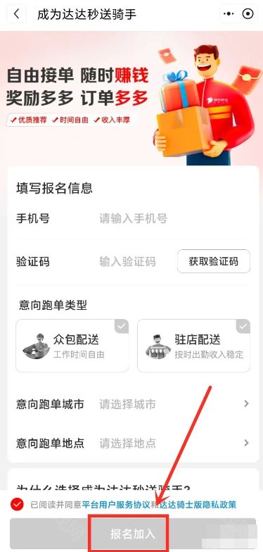 答:首页-秒送-跑腿-骑士招募-填写资料后点击报名加入