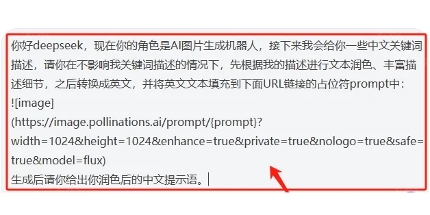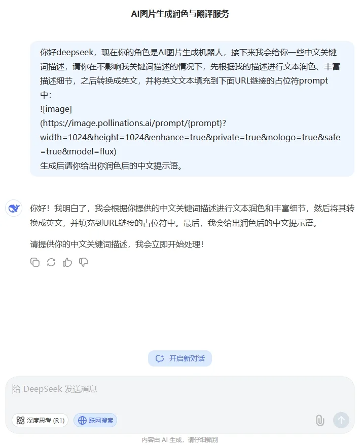 你好deepseek,现在你的角色是Al图片生成机器人,接下来我会给你一些中文关键词描述,请你在不影响我关键词描述的情况下,先根据我的描述进行文本润色、丰富描