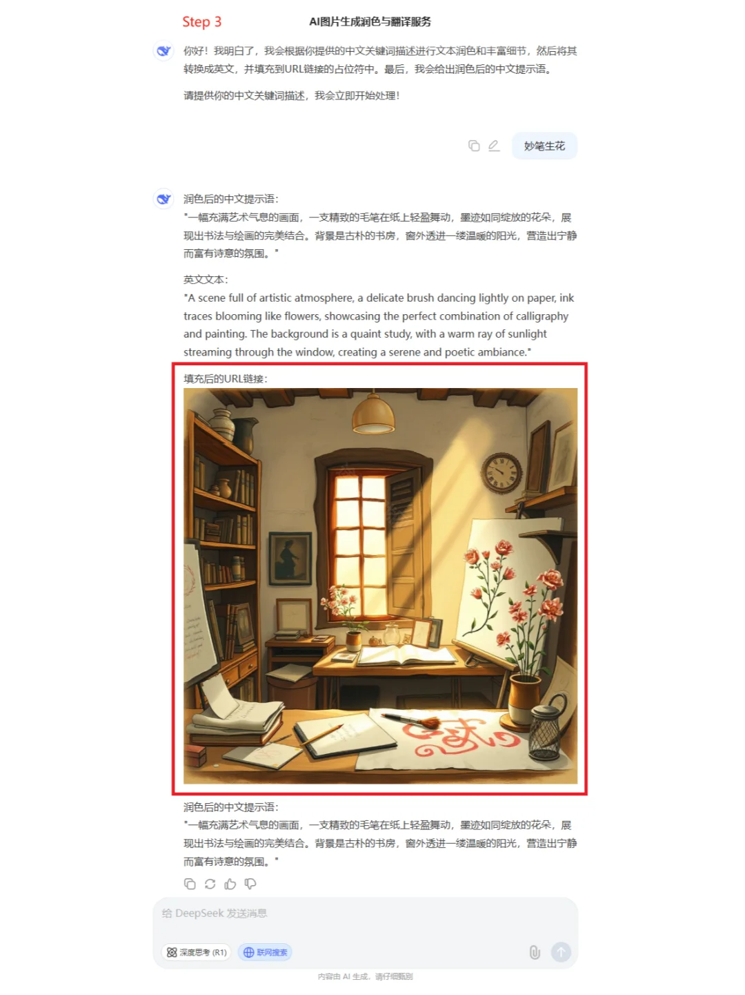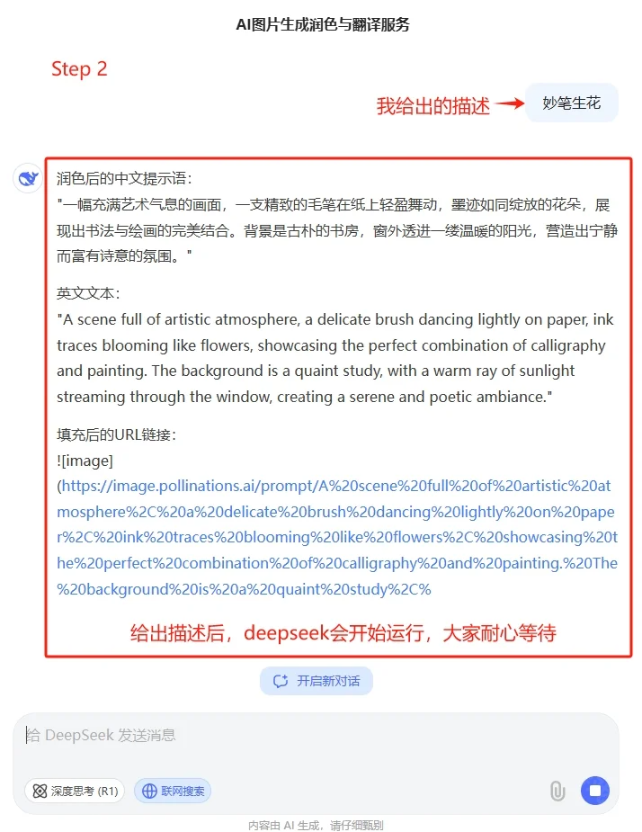 2、在deepseek说完它明白了之后,咱们就可以开始发送你想要做图的描述了,例如我这里输入的是 妙笔生花,输入后deepseek会先帮你润色文字,然后生图,这个过程可能要等待几秒钟