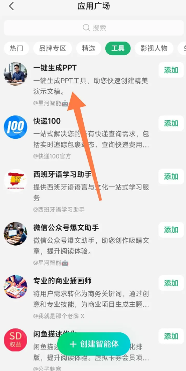 3、在工具分类中找到或搜索一键生成PPT应用,点击添加后就能开始使用了