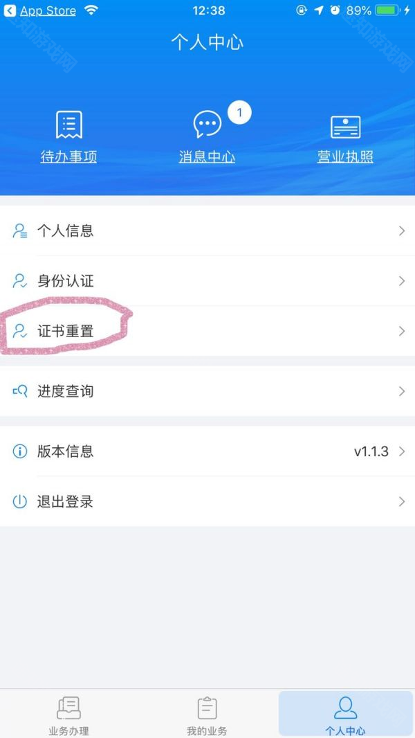 2、进入软件首页后切换到个人中心页面,找到证书重置这个选项
