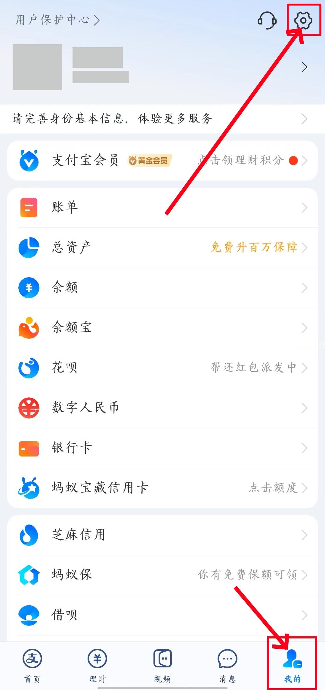 1、首先打开支付宝,选择右下角【我的】,在页面中选择右上角齿轮设置。