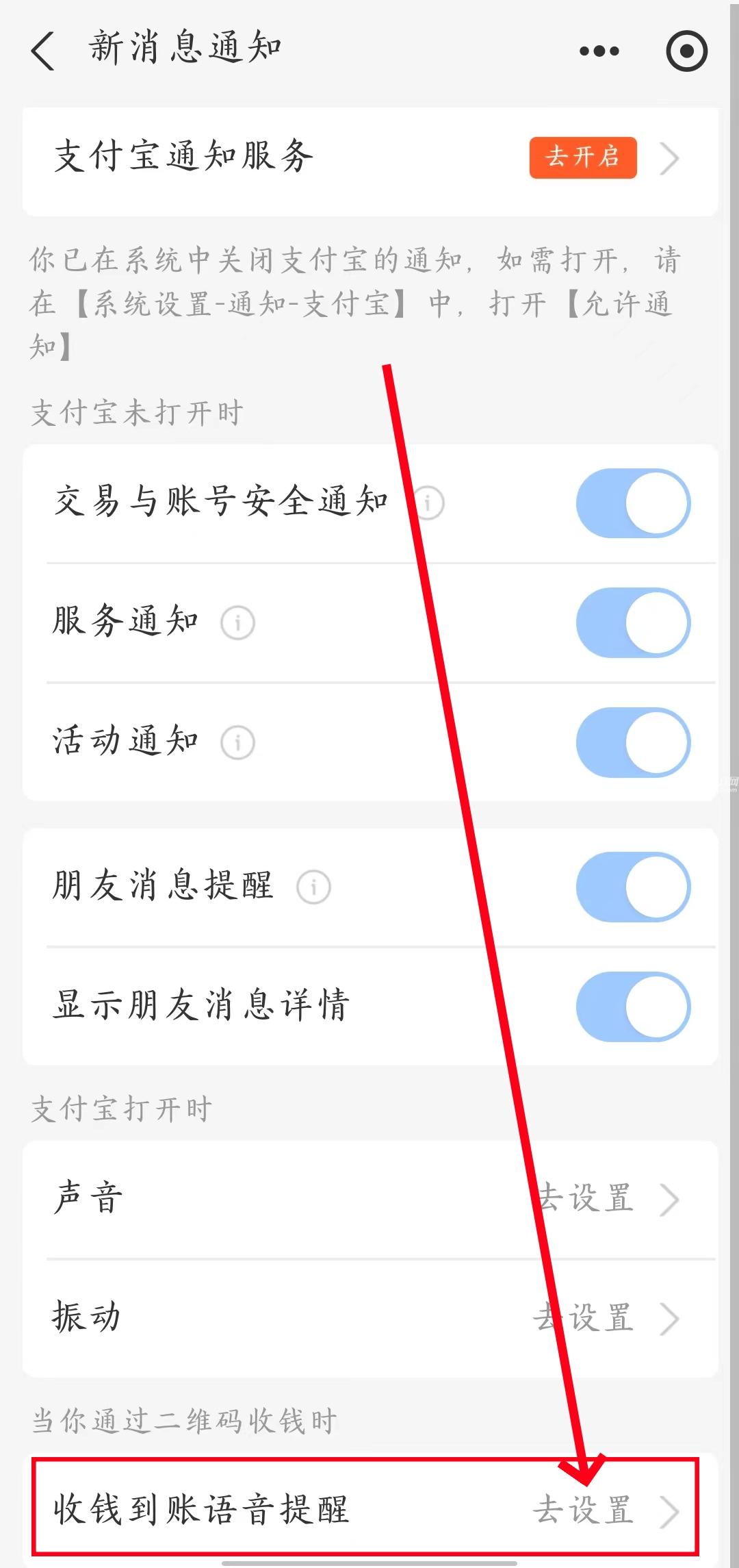 3、向下滑动,找到【收钱到账语音提醒】,点击【去设置】。