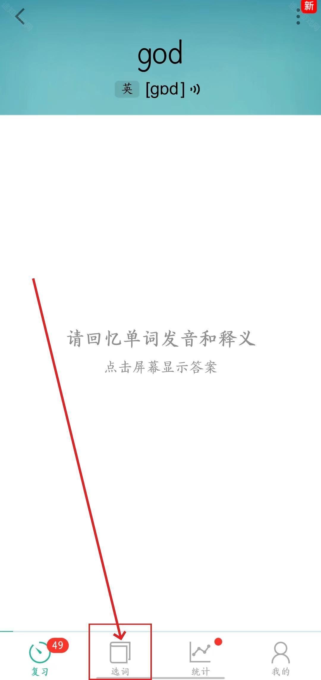 1、首先打开墨墨背单词app,点击下方【选词】。