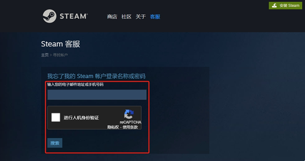 3、输入你账号所绑定的【电子邮件地址】,或者是【手机号码】,完成人机验证后,点击【搜索】;