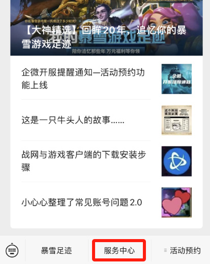 微信公众号搜索“暴雪游戏服务中心”→点击服务中心