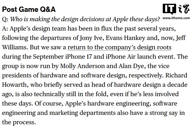 他还指出,尽管设计团队承担着重要角色,但苹果的硬件工程、软件工程以及市场营销部门同样在产品设计决策中拥有重要话语权。这种跨部门的协作模式在多位高管离任后的团队重组阶段尤为关键。