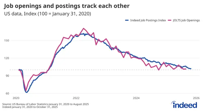 首先来看整体就业市场趋势。该报告所附图表(包含 Indeed 职位发布指数)显示,自 2022 年疫情后招聘高峰以来,全行业可提供的职位数量呈现持续下滑态势。