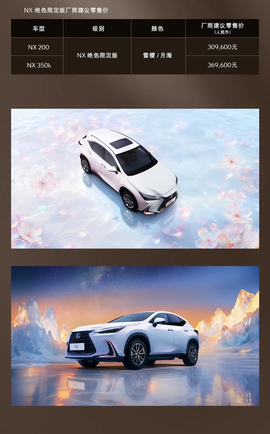 雷克萨斯 NX 绝色限定版提供“月海”与“雪樱”两款专属配色版本,NX 200、NX 350h 官方指导价分别为 30.96 万元和 36.96 万元。