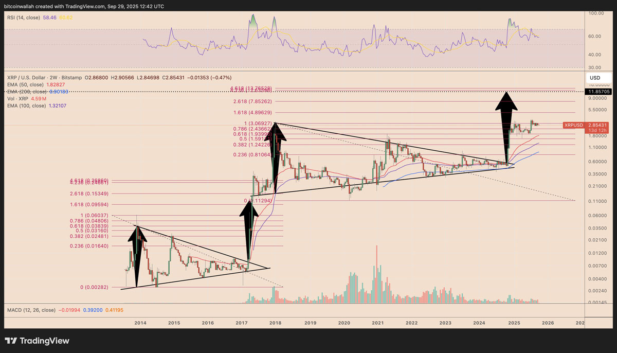 MilkibullCrypto指出:XRP"已经像2017年那样突破阻力位",暗示历史可能重演,最终推动价格向5-15美元区间发展。