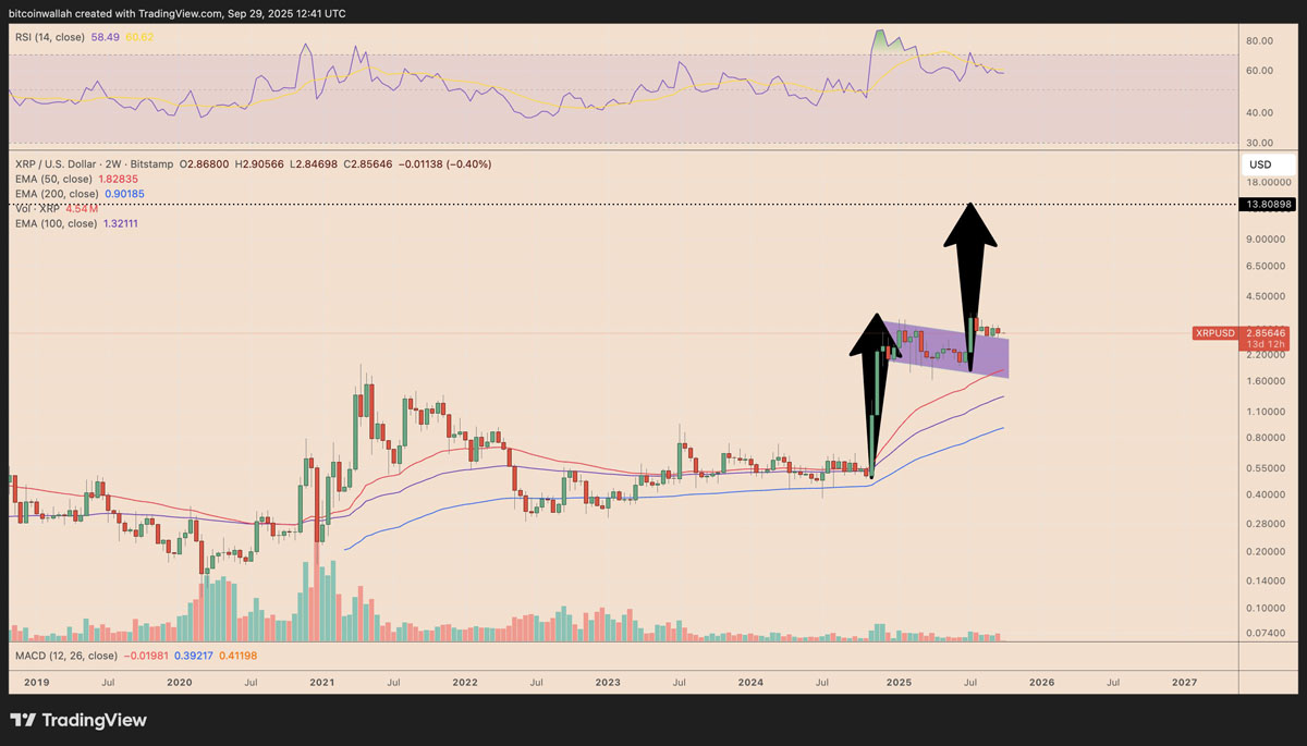 XRP正逐步接近其历史最高季度收盘价,分析师Milkybull Crypto指出,这为向15美元上涨的趋势铺平了道路。