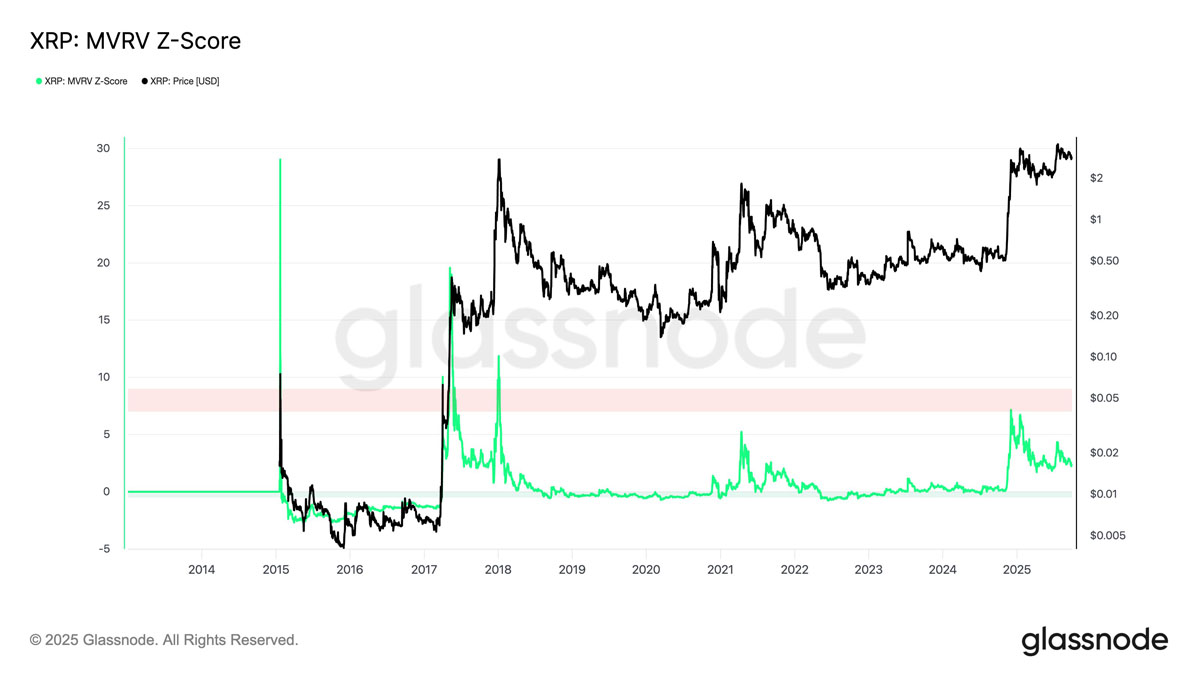 这包括XRP的MVRV Z-Score(市值与实现值的Z分数),该指标衡量市场价值超出持有者总成本基础的程度。目前该分数仍远低于曾与先前市场顶峰相对应的"过热"区间。
