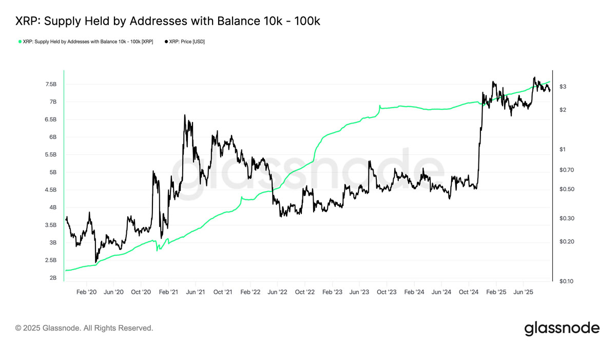 持有10至100,000枚代币的XRP钱袋在最近市场回调中表现稳定,未显示任何恐慌性抛售迹象。