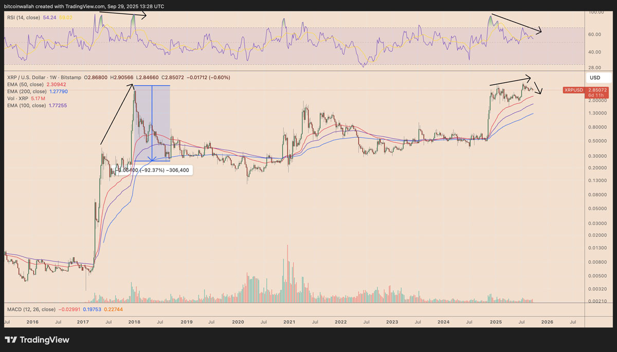 分析师指出,XRP进一步展现出上涨价格与下降相对强弱指数(RSI)间的明显背离,从技术层面表明上升动能正在减弱,这与2018年熊市前市场所呈现的状况类似。