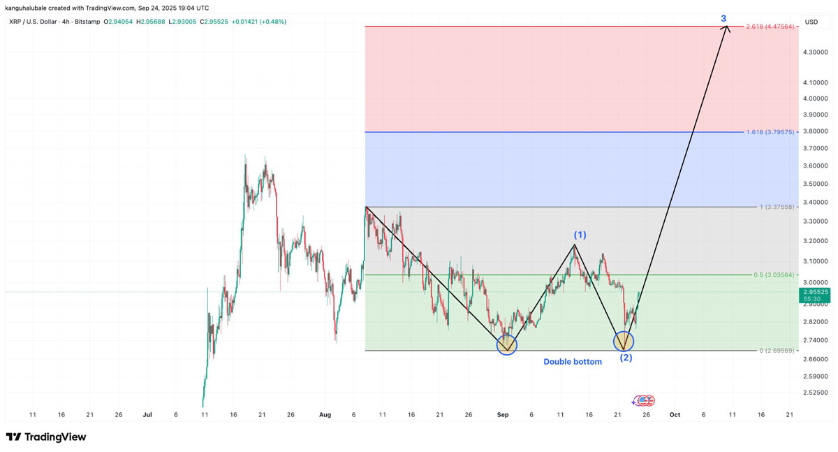 深入分析,交易员兼分析师CasiTrades指出,XRP在四小时图表上形成了"一个大规模的向下影线,在2.70美元附近构建双底形态"。