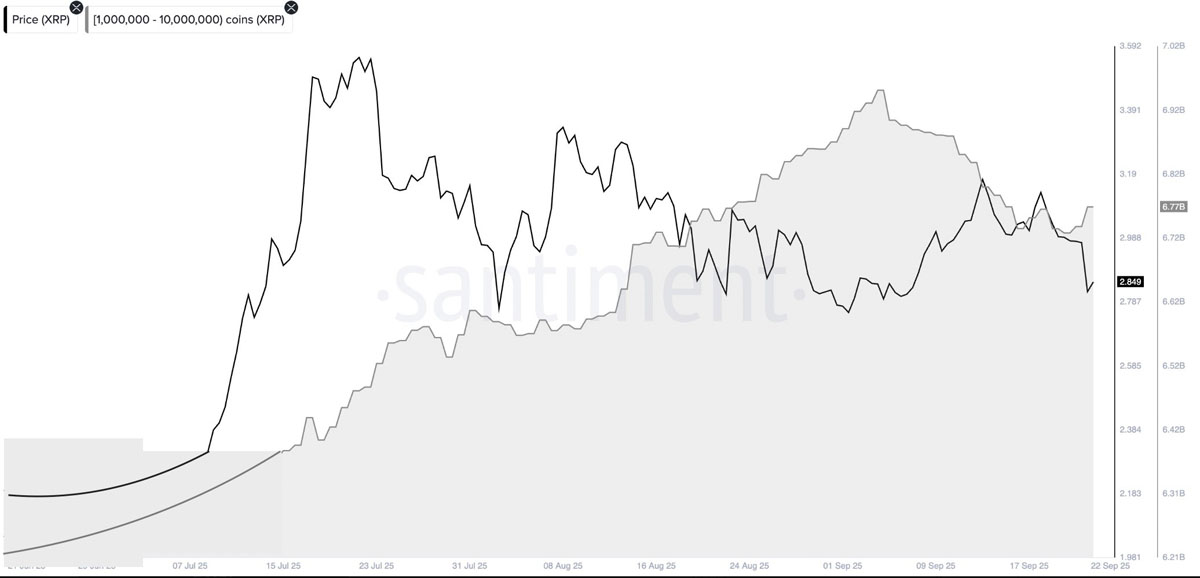 Santiment的供应分布指标显示,过去几天内持有100万至1000万枚代币的实体所持有的供应量呈现稳步上升态势。这些地址现已持有67.7亿枚XRP,在周一和周二期间又增持了3000万枚代币。这一数量占XRP总流通供应量的11%。