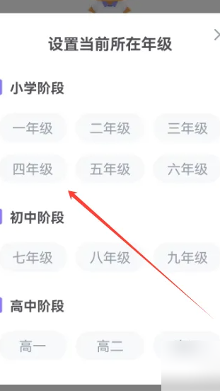 3、于设置当前所在年级页面内,选择相应年级完成所在年级的设置操作。