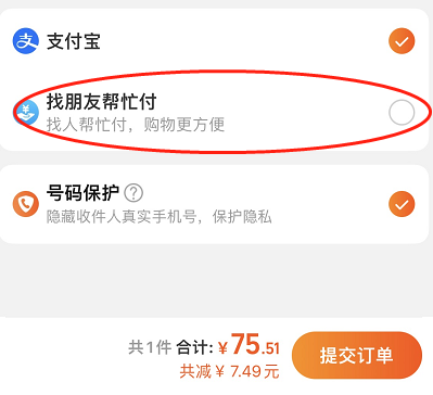 1.选择商品后生成订单,进入支付页面选择【找朋友代付】选项