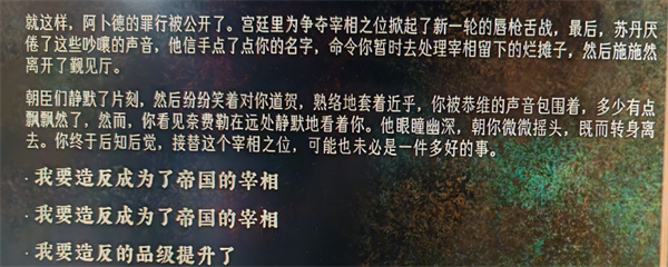 政敌哥宰相那个支线还挺麻烦的,要等芮尔查到宰相罪证/厨师款待贵客之后得到名单/参与花花公子的事件同时奈费勒在场,这三者其一之后再触发奈费勒被绑架的事件,不然时间不够用还是得当宰相,贼烦。