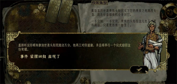 4、当哲瓦德死亡且提交爵位标识1个时触发【流落在外的爵位】选择买下来即可。
