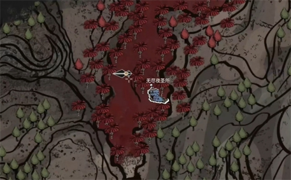 在无尽夜圣所的西北方向,它在红色植被下面。