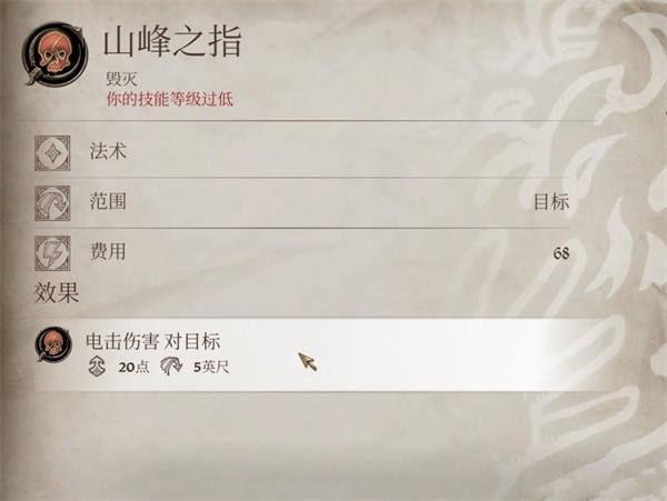 科洛尔的法师公会推荐信任务可以拿到一个闪电法术,就是山峰之指,随玩家等级提升伤害和蓝耗!