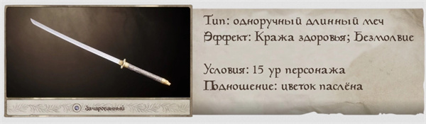 乌木之刃是以单手剑的形式呈现。当受到攻击时,它会消耗8点生命值,并对敌人施加“沉默”效果。乌木楔形法术允许最多45次攻击,而不需要重新加载。这是对梅法拉任务的奖励。