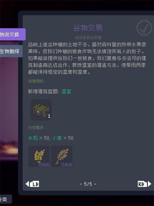 在温室里种植农作物是不用考虑季节天气的,这也是后期农作物种植的主要场所。(需要注意的是这个任务是需要水稻和小麦各50份,需要在雨季和旱季分别储备足,以免需要拖到下一年进行任务)