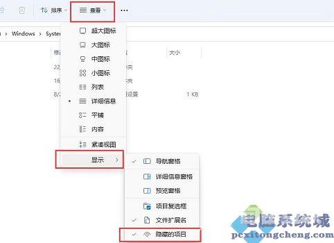 3、进入后,点击上方查看,选择显示中的隐藏的项目(如果已经显示了不需要再点)