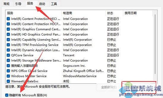 3、再进入服务,勾选隐藏所有Microsoft服务,点击全部禁用