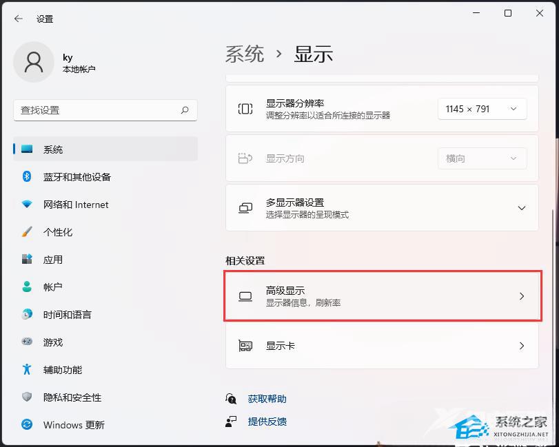 3.当前路径为:系统 - 显示,点击相关设置下的高级显示(显示器信息、刷新率)。