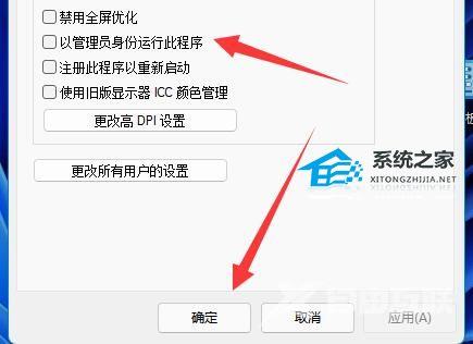 3. 然后勾选下面的“以管理员身份运行此程序”并点击“确定”。