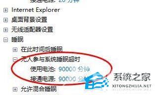 7. 最后找到“睡眠”下“无人参与系统睡眠超时”,将时间改为“90000分钟”即可。