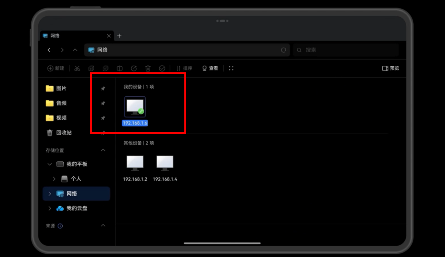在平板上打开文件管理器,从左侧菜单栏进入“网络”。