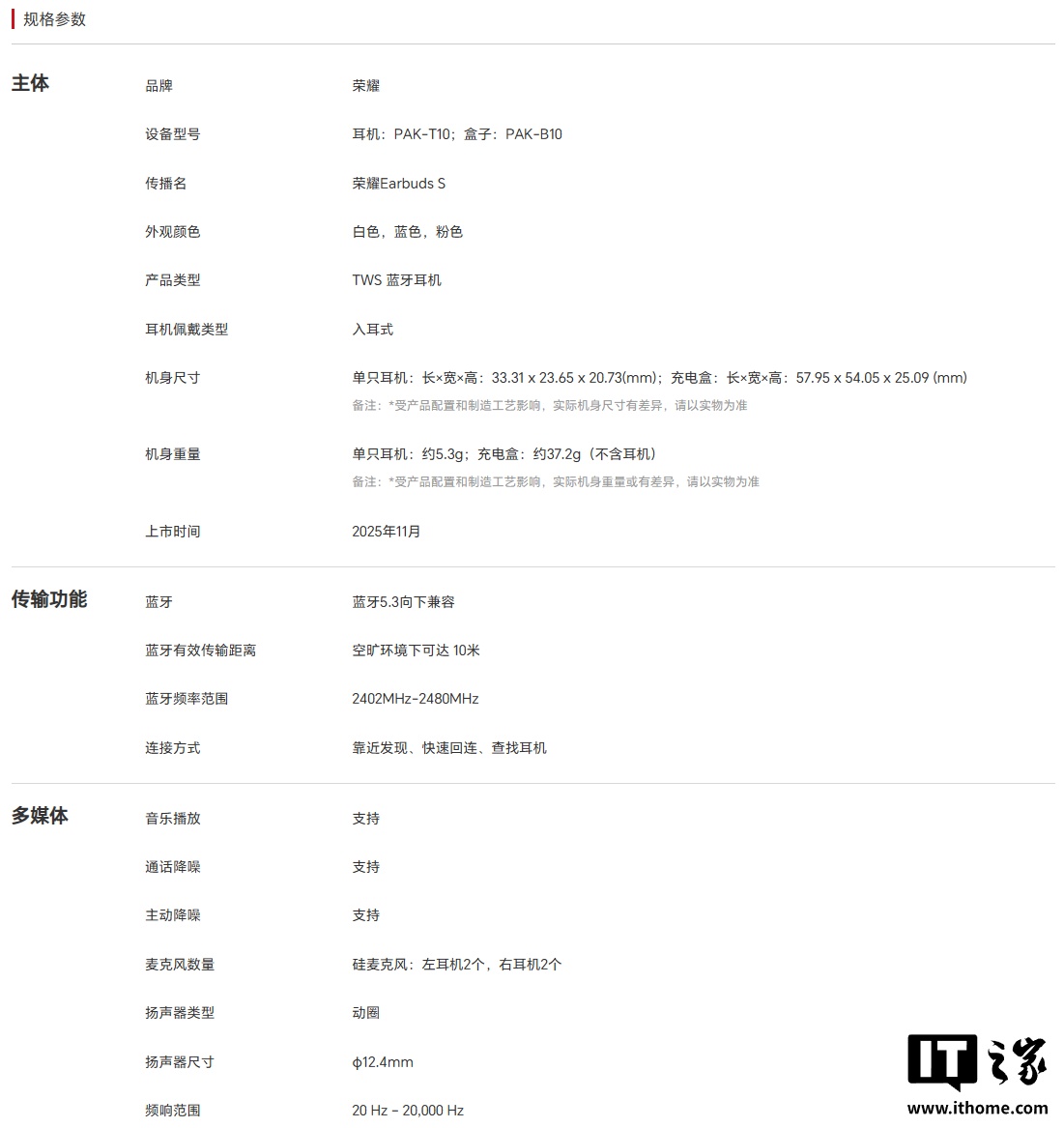 附荣耀 Earbuds S 无线耳机规格参数如下: