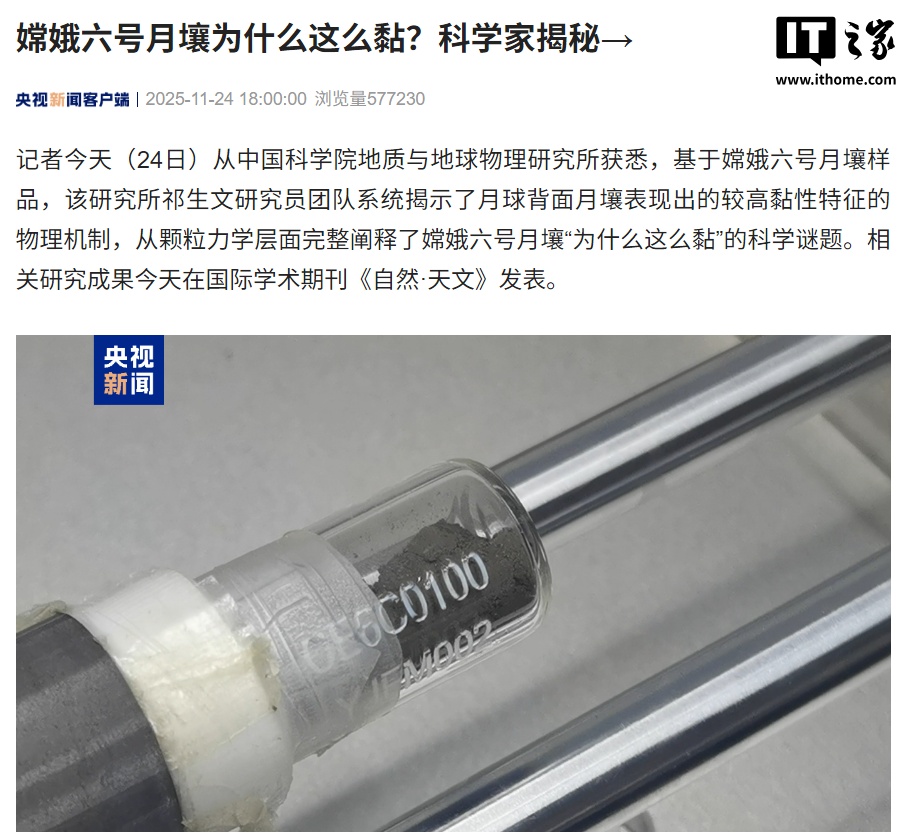 11 月 24 日消息,据央视新闻今日报道,基于嫦娥六号月壤样品,中国科学院地质与地球物理研究所祁生文研究员团队系统揭示了月球背面月壤表现出的较高黏性特征的物理机制,从颗粒力学层面完整阐释了嫦娥六号月壤“为什么这么黏”的科学谜题。