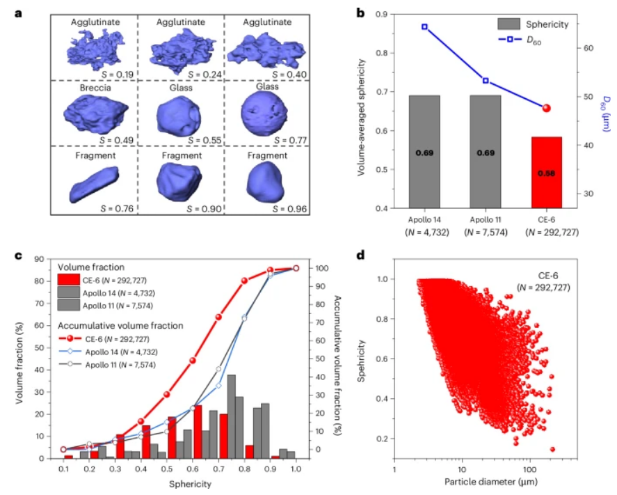 在此基础上,科研团队对嫦娥六号返回样品进行了 1 微米的高空间分辨 CT 扫描,通过对超过 29 万个月壤颗粒的尺寸与形态进行精确厘定,并同月球正面嫦娥五号和阿波罗月壤对比,发现嫦娥六号月壤颗粒更细,形态更复杂,整体球度显著偏低。