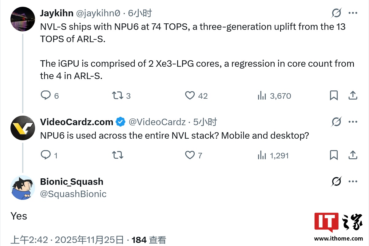11 月 25 日消息,消息人士 @jaykihn0 在北京时间今日的 X 平台爆料中表示,英特尔的 "Nova Lake-S" 处理器将大幅强化 NPU 性能,算力将从 "Arrow Lake-S" 上 NPU 3 的 13 TOPS 提升至 NPU 6 的 74 TOPS,实现三次代际提升。