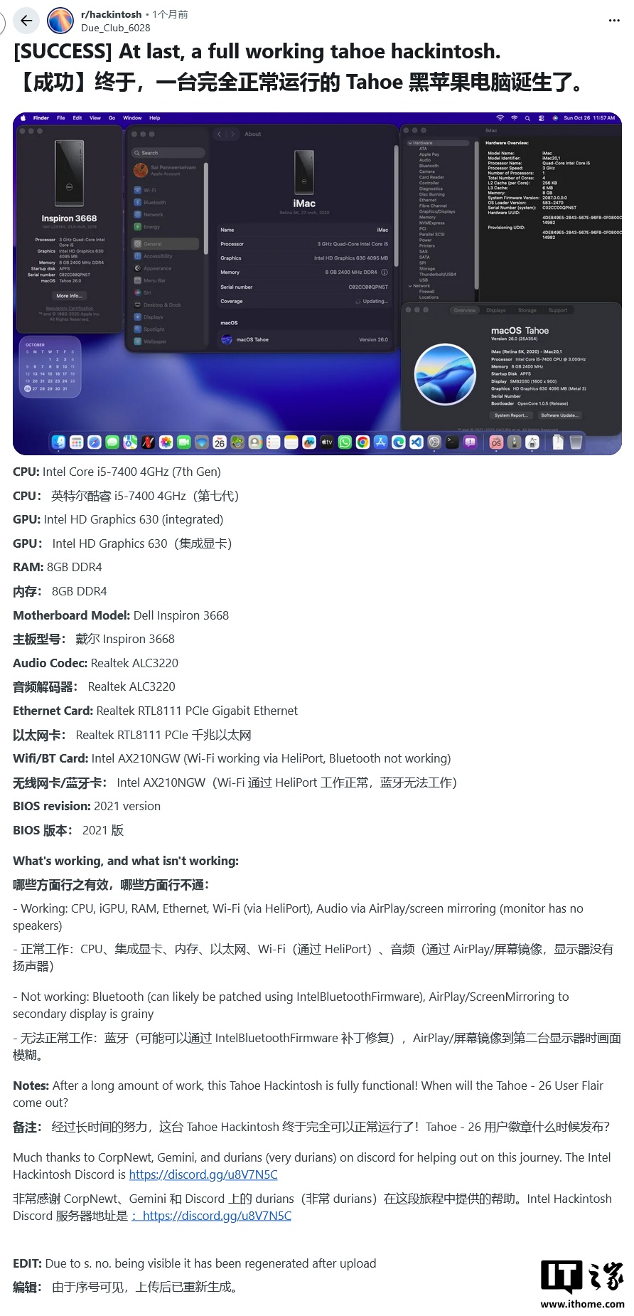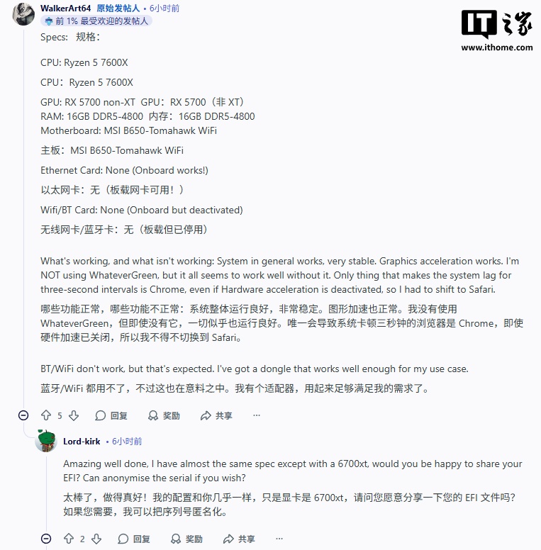 尽管前景黯淡,黑苹果社区依然展现了强大的技术热情,迎来了这场“最后的狂欢”。援引博文介绍,在 macOS Tahoe 正式版发布后,社区用户在 Reddit 等平台分享了他们的成功经验。