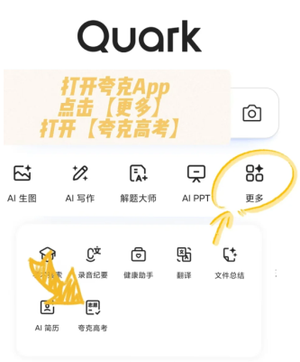 1.启动夸克APP,点击【更多】选项进入夸克高考专属模块