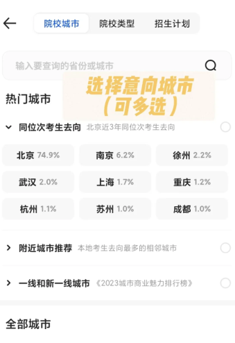4.灵活选取多个意向城市,系统会自动匹配地域符合条件的高校