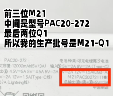 充电宝底部编码包含完整信息:以M21PAC20272111Q1为例,前三位M21代表生产批次前缀,中间PAC20-272为产品型号,末尾Q1为批次后缀,组合后完整批号为M21-Q1。具体分解如下: