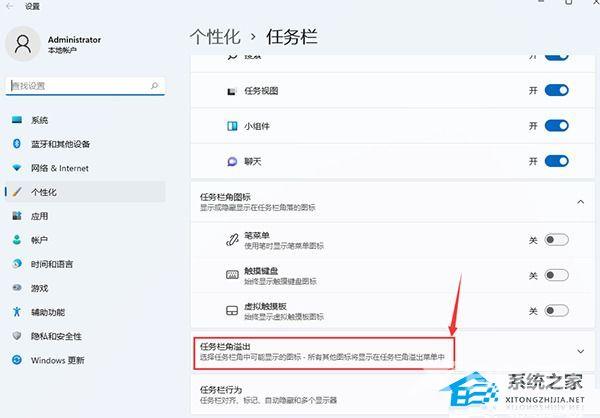 3. 点击任务栏角溢出后,将将要显示的应用图标开关打开。