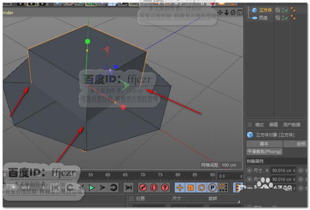 2、创建一个正方体,所有参数不用修改;利用缩放工具,将正方体缩小(大小为开四方孔的大小),保证正方体的四条棱边与圆盘上的旋转分段一一对应。如图所示。