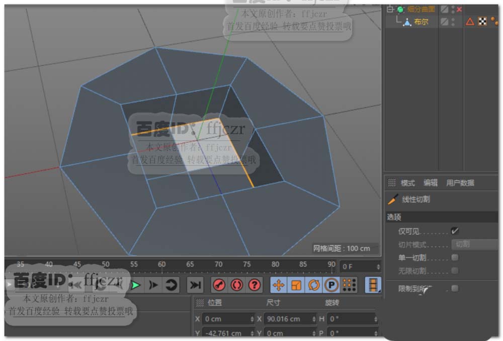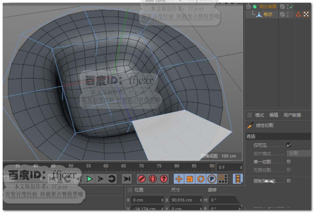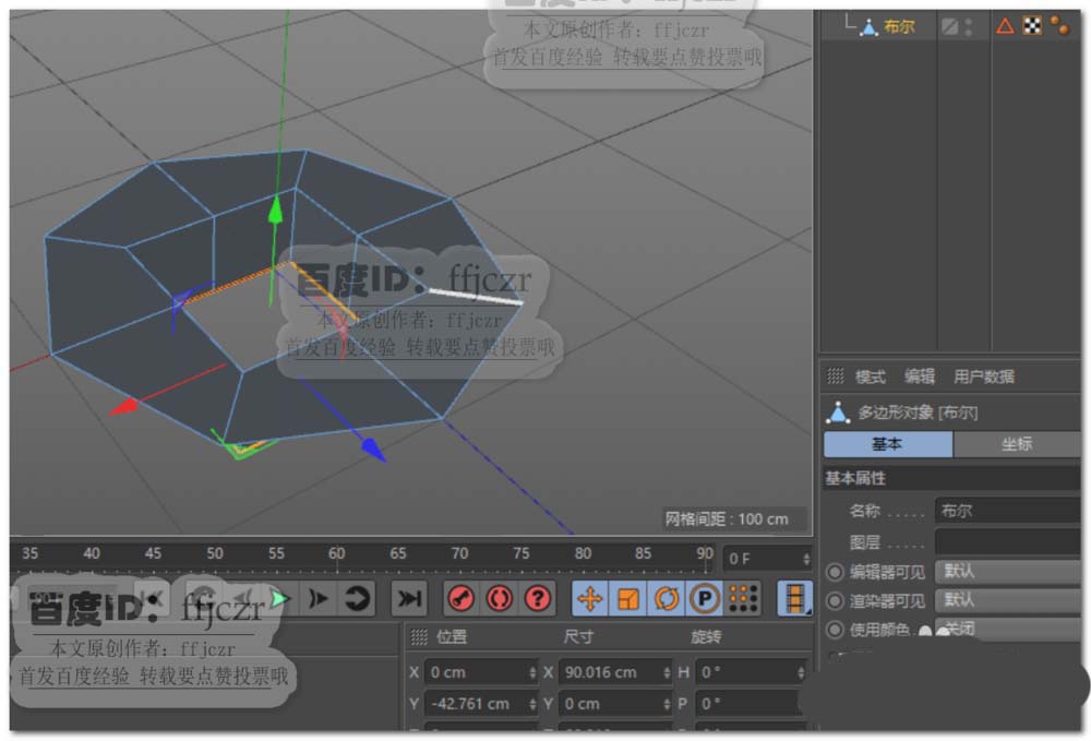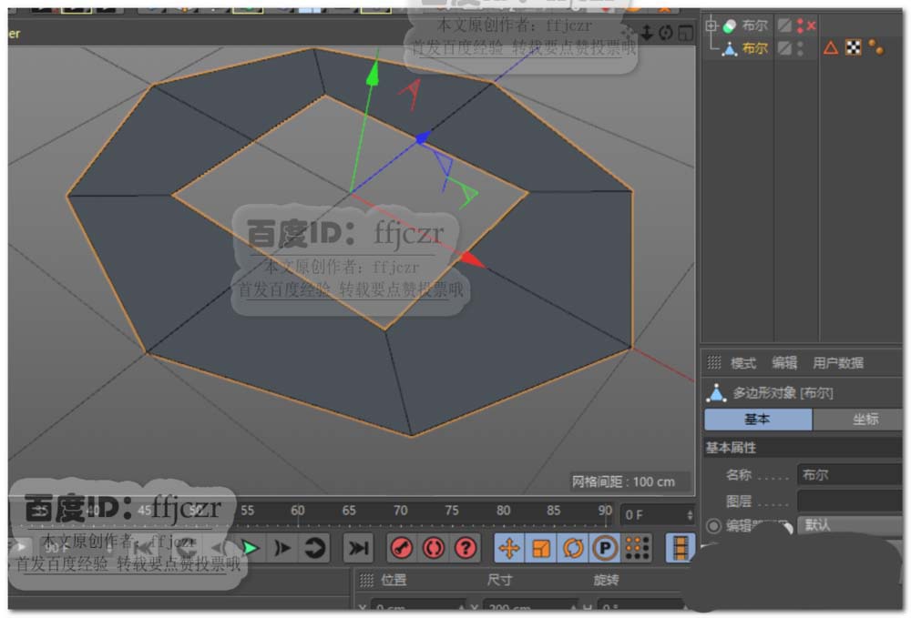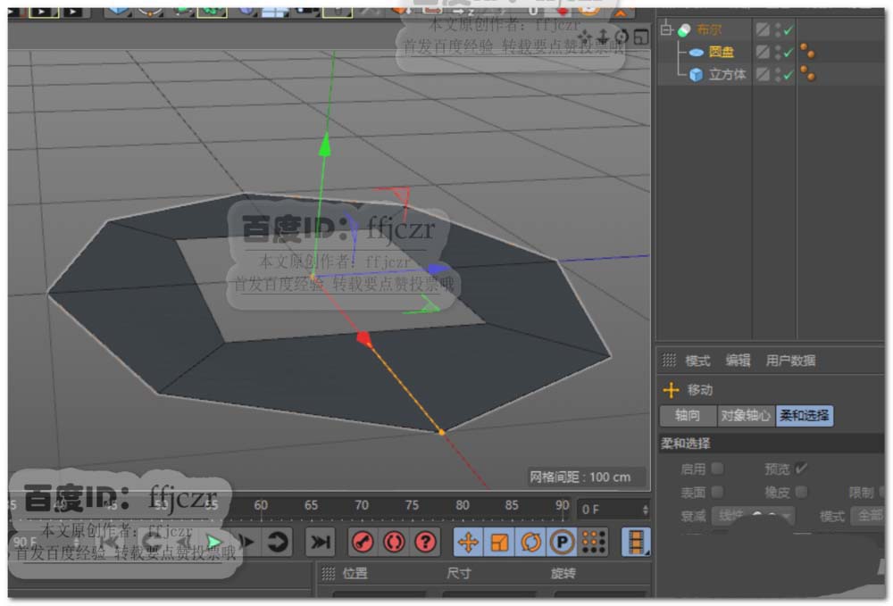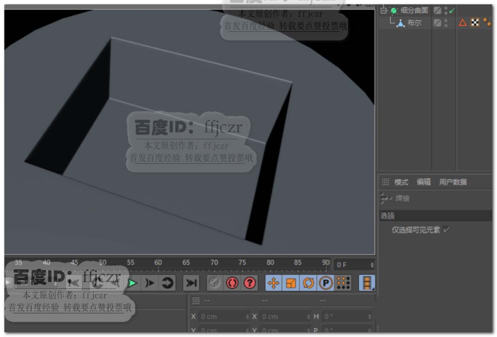 3、添加一个布尔,分别将圆盘与正方体拖到其子级中;布尔类型为A-B。选中布尔,将当前状态转为对象,将转为的对象连接对象+删除。原布尔隐藏