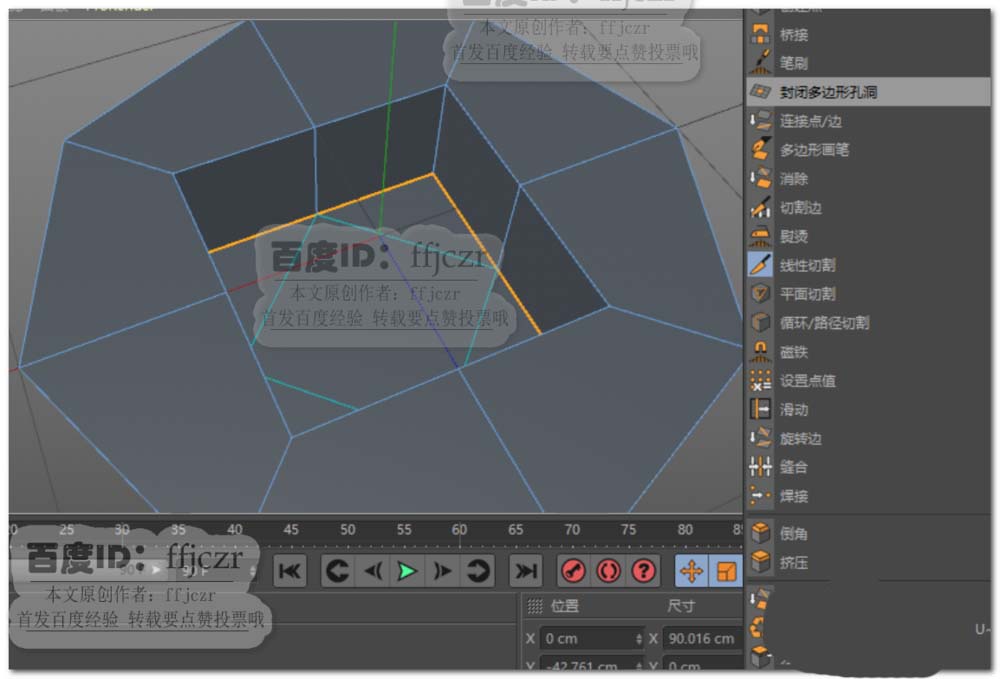 4、边模式中,选中圆盘内的四边形边;向下挤压适当距离,选用封闭多边形孔洞将底部开口封闭。