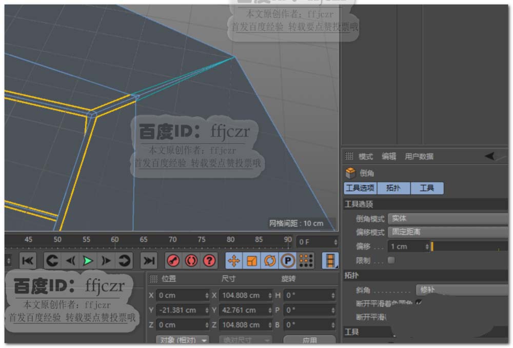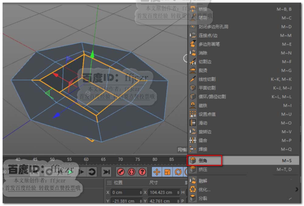 7、选择四方形沉孔的轮廓边,包括四方沉孔与上步循环边之间的连线;对选中的边进行倒实体角,偏移值为1.