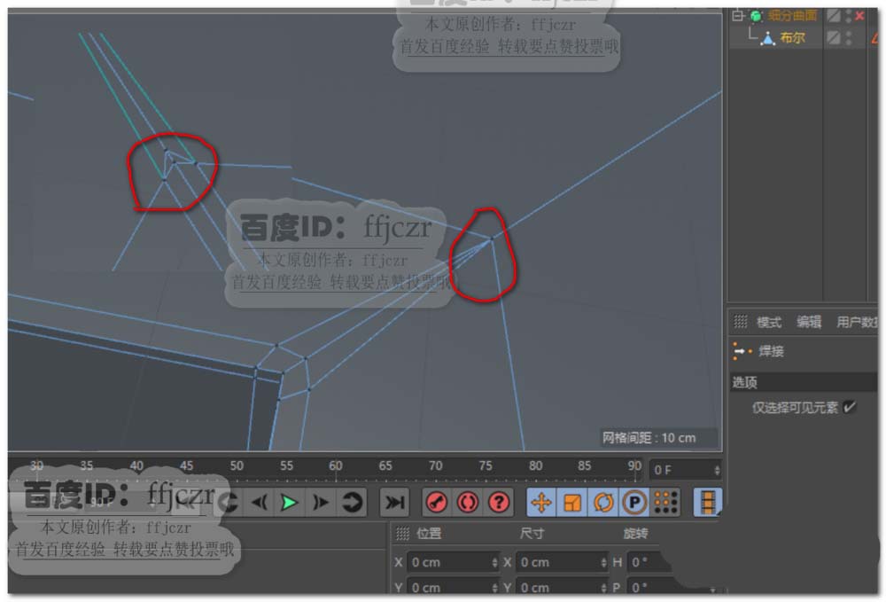8、对倒角后产生的N-gon线进行修改,如图1将左边红圈内的三个点用焊接工具将其焊接成一点。此时开启细分曲面,渲染即可得到圆滑的硬边效果。