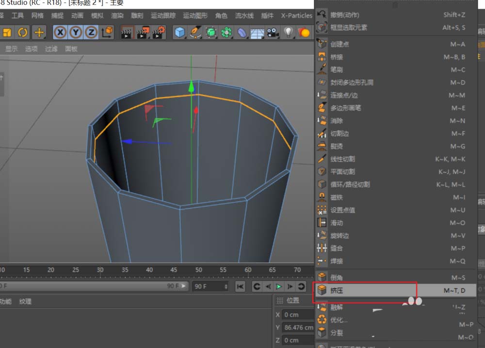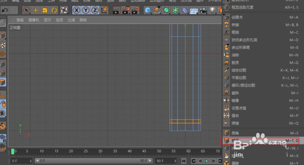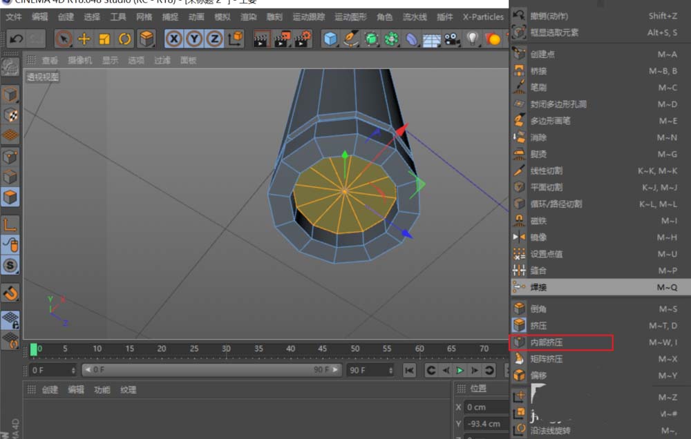 2、面模式下,选中被切线分开的一圈面,利用挤压,向内挤压一段距离。