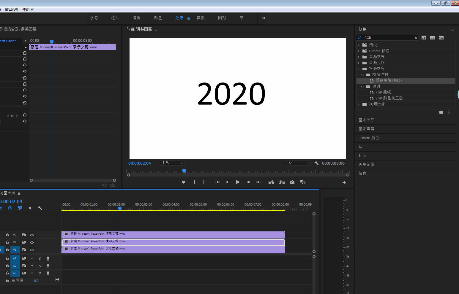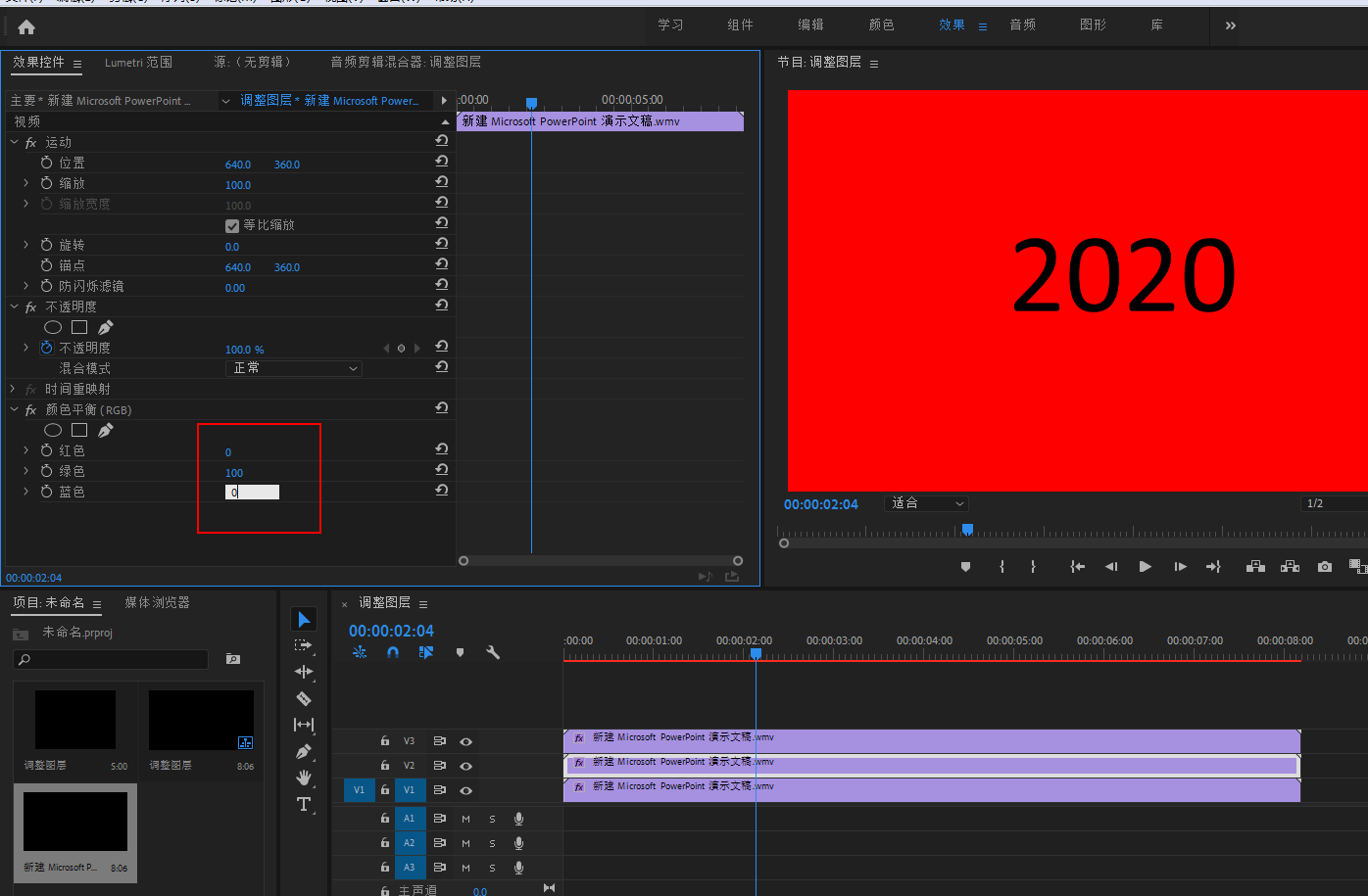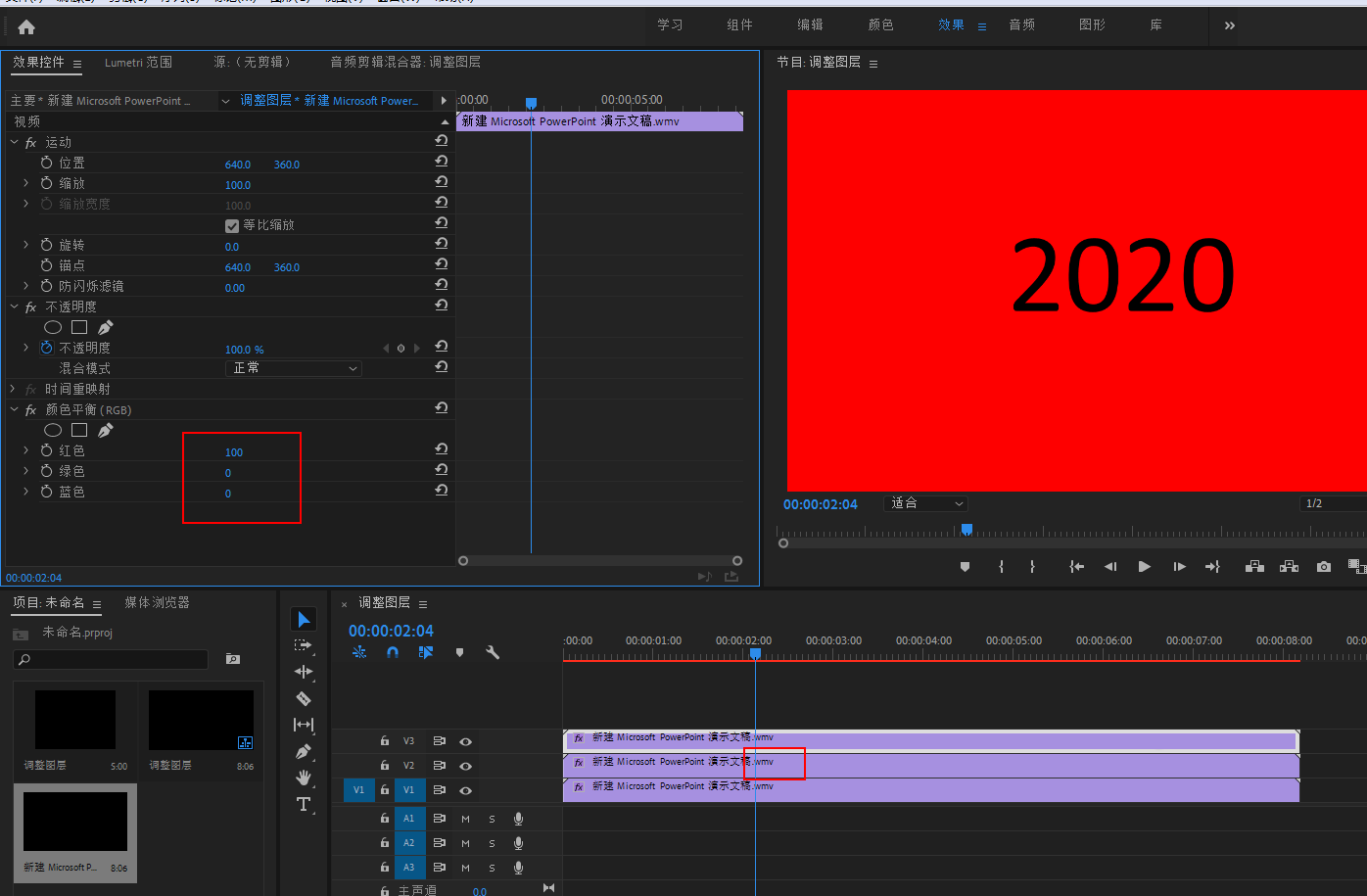 2、选效果,搜索RGB,把颜色平衡(RGB)分别加入到三层素材上,如下。